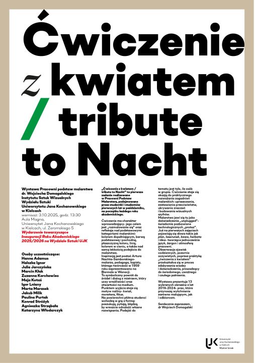 „Ćwiczenie z kwiatem / tribute to Nacht” to pierwsze zadanie realizowane w Pracowni Podstaw Malarstwa, podejmowane przez studentki i studentów pierwszych lat w październiku, na początku każdego roku akademickiego.