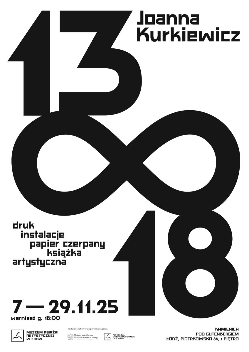 13 x 18 x ∞ to retrospektywna wystawa ukazująca prace z ostatnich 15 lat twórczości artystycznej i projektowej Joanny Kurkiewicz. Ekspozycja prezentuje cykl prac – linorytów na płótnie, zrealizowanych w ramach pracy doktorskiej na Uniwersytecie im. Jana Kochanowskiego w Kielcach „Archipelagi emocji”, szereg prac z papieru czerpanego począwszy od okresu studiów na łódzkiej Akademii Sztuk Pięknych do czasów obecnych oraz kolekcje papiernicze powstałe w ramach marki własnej projektantki Papier + druk na przestrzeni ostatnich 9 lat. Na wystawie zaprezentowane zostały również premierowo 3 monumentalne kompozycje na bazie papieru czerpanego z cyklu Układanki o formatach 320 x 90 cm oraz linoryt Talizmany. Agat o formacie 100×70 cm.